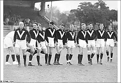 Prior to the advent of the iconic Big V guernsey, the team wore various designs. Early in the 20th century, the kit was a white guernsey with a sash. Later, it wore a plain navy guernsey with white-and-silver pin stripes along the sleeves.