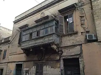 ![]() Villa Bonici in a dilapidated state; above balcony figure representing Emanuel Testaferrata Bonici Ghaxaq | |