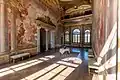 The villa consists of a monumental central block flanked horizontally by two porticoed barchesse, intended to house the servants, which are arranged in an entirely symmetrical position. At its centre, the façade contains four Ionic semicolumns and a triangular tympanum; this neo-Palladian motif is presumably an 18th-century addition, as are the sections which connect the main block to the two barchesse.[2] Inside, on the upper floor, there is a spectacular double-height hall with balconies at the ends, entirely frescoed by the Venetian painters Gerolamo Brusaferro and Niccolò Bambini, and by perspective painters probably from Emilia. These were commissioned around 1720 by the Loredan owners. The frescoes contain extraordinary depictions of episodes of ancient Roman history, and the ensemble is certainly one of the greatest examples of Baroque pictorial decoration in the Veneto. Very remarkable is the original architecture of the public/private oratory, dedicated to the Madonna of Loreto, detached from the villa and facing the front road. The oratory has a circular plan with a united triple apse presbytery.[3]