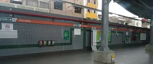 Villa María is a Lima and Callao Metro station on Line 1. The station is located between Pumacahua and María Auxiliadora. It was inaugurated on 28 April 1990 as part of the first section of the line between Villa El Salvador and Atocongo. However, commercial service only started on 18 January 2003, was suspended in July 2003 due to the lack of funds, and resumed only on Saturdays and Sundays on 17 January 2004. The full revenue service started on 3 January 2012, with trains running to Miguel Grau.[1][2]