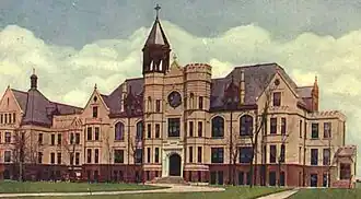 The Visitation Sisters came to Rock Island from Maysville, Kentucky in 1898.[3] They established a school on Fifth Avenue near Sacred Heart Church. Because of the success of the school, they chose to build a larger school and bought property on Ball's Bluff at the edge of Highland Park. The first part of the complex opened in 1901. Within five years the school had grown to 60 boarders and a larger addition was built to expand the school. The older section of the building housed the convent and the new section housed the dormitories, classrooms, and chapel. A chaplain's bungalow was added to the property in 1919. The east wing of the building, known as Lewis Hall, was built in 1929 and contained classrooms and a gymnasium. This expansion was funded by Frank Lewis and a fundraising drive led by Thomas P. Sinnett.[4]
