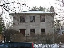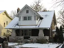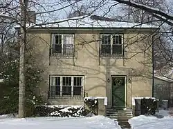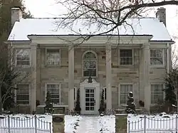 As limestone workers and owners, the residents of Vinegar Hill naturally looked to limestone as the material for their own houses.[2]: 89 They used these materials to construct residences in a wide range of architectural styles, including American Craftsman, Neoclassical, and Art Deco. Inside, the houses were also ornate: many feature mantels and balusters of carven stone,[3] and the four houses built by Christopher Donato also include elaborate transoms and lintels. The most prominent houses in the neighborhood are the hilltop homes of the wealthy near the eastern end of the district; here may be found styles such as Tudor Revival and Georgian-influenced Colonial Revival.[2]: 90 Throughout the district, many houses are found in various forms of Colonial and English Revivals,[4] and multiple Spanish Colonial Revivals are among the most significant residences of the lower part of the hill. Among the books that have concentrated on the architecture of Vinegar Hill is Carol Shields' novel The Stone Diaries, in which the neighborhood is part of the setting for much of the novel.[2]: 91