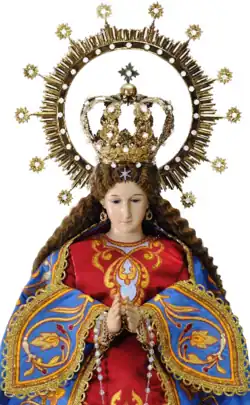 Attributes | The Blessed Virgin Mary encrusted with jewels, golden crown, aureole and moon. |