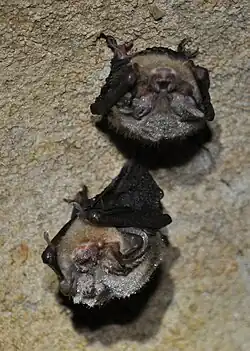 White-nose syndrome (WNS) is one of the worst wildlife diseases in recent history that is currently decimating North American cave-hibernating bat populations.[26] This epidemic is responsible for mass mortalities in hibernating North American bats, and is caused by a uniquely cold-adapted fungus Pseudogymnoascus destructans. The fungus begins to grow on bats during the winter hibernation season, when bats are in torpor and immune-compromised. The body temperature of a hibernating bat is the optimal fungal growth environment.[26] The fungus has affected 90% of species that hibernate in caves for the winter. Pseudogymnoascus destructans spores have been found growing on the Virginia big-eared bat. To date, no WNS mortality in this species has been observed although the syndrome has killed millions of its fellow cave-dwelling species.[27] It is currently thought that the Big Ears may have a natural immunity to WNS through a yeast that the bat 'combs' over their body that inhibits the growth of the WNS fungus.[28]
