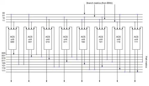 The core elements of a PMU are ACS (Add-Compare-Select) units. The way in which they are connected between themselves is defined by a specific code's trellis diagram.
