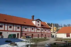 The first mention of a brewery in Vlachovo Březí is from 1623. The Manor Brewery in its current form was founded around 1670 and its capacity caused the gradual demise of breweries in the surrounding villages.[8][9] The Baroque brewery building with distinctive gables was built in the 18th century and forms the western wing of the castle complex. The beer brewing continued until 1924.[10] In 2014–2015, the valuable building was repaired and now it is owned by the town.[8] The beer brewing was renewed in 2017.[9]
