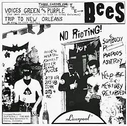 The Bees recorded "Voices Green and Purple" and released it as a single on the Liverpool label backed with "Trip to New Orleans" in October 1966.[2][3][4][5] "Voices Green and Purple" has been cited by rock historian Mike Stax as an influential example of "acid punk."[3] The song begins at a medium tempo, but then speeds up into a fast-paced thrash in the refrains. As Stax describes: "...when the song comes unglued the for the panic-stricken choruses, these guys were in uncharted waters."[3][5] According to music critic Richie Unterberger, "The psychedelic touch was added not just by the florid and deranged lyrics, but by the choruses, where the tune disappeared, the drums sped up, and the scrawling guitars made ascending shards of noise."[2] The single came wrapped in a paper jacket adorned with the kind of scrawled lettering and defaced imagery suggestive of later "D.I.Y." punk fanzines.[5][6] The Bees who recorded "Voices Green and Purple" are not to be confused with another band of the same name who were also active in the Los Angeles area at the time, who recorded on the Mira and Mirwood labels.[4]