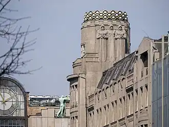 - the three figures at the crown of the Koruna Palace at the Wenceslas Square in Prague, 1912–1914