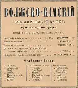 The Volga-Kama Commercial Bank (sometimes Volzhsko-Kamsky Commercial Bank, Russian: Во́лжско-Ка́мский коммерческий банк), often referred to simply as the Volga-Kama Bank, was a major commercial bank of the Russian Empire. Founded in 1870, it was Russia's largest private-sector bank by total assets at the start of the 20th century.[1]: 43 In late 1917 following the Russian Revolution, like all other commercial banks in Russia, it was absorbed into the State Bank with no compensation to its shareholders.[2] Its name refers to the rivers Volga and Kama.