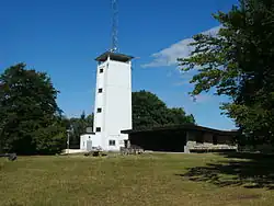 On the summit plateau there is a shelter as well as the 23-metre (75 ft) Volkmarsberg tower,[3] a stone observation tower built in 1930, from which one has a far-reaching view over the entire Ostalbkreis.[4] In rare temperature inversion conditions the 180-kilometre (110 mi) distant Zugspitze can be seen.[5]
