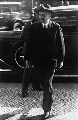 During the course of the winter of 1929–30, Schleicher undermined the "Grand Coalition" government of Hermann Müller by means of various intrigues, with the support of Groener and Hindenburg.[31] In January 1930, after receiving Zentrum party leader Heinrich Brüning's assent to heading a presidential government, Schleicher had told Brüning that the "Hindenburg government" was to be "anti-Marxist" and "anti-parliamentarian", and under no conditions were the Social Democrats to be allowed to serve in office, even though the SPD was the largest party in the Reichstag.[32] In March 1930, Müller's government fell, and the first presidential government headed by Brüning came into office.[33] The German historian Eberhard Kolb described the presidential governments that began in March 1930 as a sort of 'creeping' coup d'état, by which the government gradually become more and more authoritarian and less and less democratic, a process that culminated with the Nazi regime in 1933.[34] The British historian Edgar Feuchtwanger called the Brüning government Schleicher's "brainchild".[35]