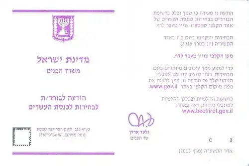 A voter invitation card, voter notification card, poll card, or notice of election card, is an informational leaflet, usually of the size of a postcard, which requests voters to attend the elections and which generally contains information regarding elections, place and time of voting, and contact details of the electoral commission.