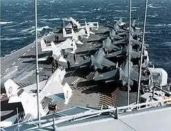 By late 1964, sufficient airframes had been delivered to allow a full scale programme of flight deck trials – in November, the second and third production models were used aboard the aircraft carrier USS Shangri-La by pilots from both France and the United States. These two airframes, plus aircraft number 4, were also used for weapons trials, including fit checks of the R.530 missile, at NAS China Lake in California. The success of the trials programme in the US led to the Crusader achieving its initial operational status in late 1964. On 6 October 1964, the initial batch of 13 aircraft were loaded aboard Arromanches at Naval Station Norfolk in Virginia for transport back to France.[7] While these were en route, the Aéronavale activated Flottille 12F as its first Crusader squadron. Arromanches arrived in Saint-Nazaire on 4 November, with its load of aircraft disembarked for transport to BAN Lann-Bihoué in Brittany, which was the new home base of the Crusader force.[14] Five months after 12F was reformed, the Aéronavale formed a second Crusader squadron, Flottille 14F, on 1 March 1965, while the remaining 29 aircraft were transported from the United States aboard Foch.[14] The Crusader's first deployment came in April, when 12F sent four aircraft to operate from Clemenceau in the Mediterranean for a week to evaluate the Crusader's performance integrated with the remainder of the French air group. At the same time, the Aéronavale created a detachment, DEM 530, to coordinate the integration of the R.530 missile with the Crusader, while more flight tests with the aircraft were undertaken, including testing its in-flight refuelling capability.[7] Having been grouped together to form Carrier Air Wing 2, 12F and 14F were declared operational on 1 March 1966.[7] From 1966 onwards, 12F and 14F shared responsibility for providing up to 10 aircraft to make up the interceptor squadron assigned to one of the French aircraft carriers.[15] In 1968, the entire Crusader force was moved from BAN Lann-Bihoué to take up residence at BAN Landivisiau on the northern coast of Britanny.[16]