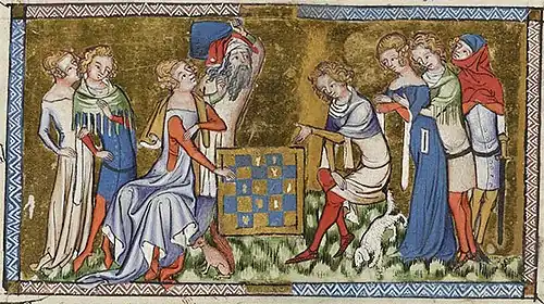 Vows of the Peacock (French: Voeux du Paon) is a poem composed by Jacques de Longuyon between 1312 and 1313 for the Bishop of Liège, Thiébaut de Bar. The poem describes courtly activities and amusements during truces in a battle.[1] Alternating between intense battle sequences and an idealised court setting, the poem emphasises notions of chivalry and valiance. The narrative culminates in a banquet where the gathered knights and ladies take turns swearing on an elaborately prepared peacock. Voeux was created as a later self-contained addition to the Roman d'Alexandre and achieved significant contemporary success.[1] Through numerous illuminated manuscripts, and then later printed books, the story became well known. Longuyon’s grouping of the 'Nine Worthies’ in this text became a defining topos of the late Middle Ages.[2]