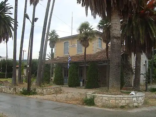 The station opened originally opened on 15 December 1888[4] as the fourth intermediate stop on the Patras-Kyparissia railway line, serving Vrachneika, Dresthena and Monodendri communities. The station closed during World War I, but it's unclear when, however, the line continued to be used. In 1970 OSE became the legal successor to the SEK, taking over responsibilities for most of Greece's rail infrastructure. On 1 January 1971, the station and most of Greek rail infrastructure were transferred to the Hellenic Railways Organisation S.A., a state-owned corporation. Freight traffic declined sharply when the state-imposed monopoly of OSE for the transport of agricultural products and fertilisers ended in the early 1990s. Many small stations of the network with little passenger traffic were closed down. In 2005 operations from the station were suspended due to the reconstruction works of the OSE railway network in the region. In 2009, with the Greek debt crisis unfolding OSE's Management was forced to reduce services across the network. Timetables were cut back, and routes closed as the government-run entity attempted to reduce overheads. The station reopened on 9 July 2010 as part of the Proastiakos Patras services, served by trains between Agios Andreas and Agios Vassilios stations. Since the suspension of regional services on the metre-gauge railways of the Peloponnese in 2011,[7][8] In 2017 OSE's passenger transport sector was privatised as TrainOSE, currently, a wholly owned subsidiary of Ferrovie dello Stato Italiane[9] infrastructure, including stations, remained under the control of OSE. It reopened on 29 February 2020 as the fifth stop of Line 1 of the Patras Suburban Railway, with an operating with the extension of its routes to the town of Kato Achaia[5][6]