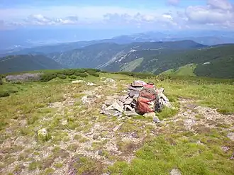 Vranica (Serbian Cyrillic: Враница) is a mountain range in the Dinaric Alps of central Bosnia and Herzegovina, located between the town of Gornji Vakuf in the west and the town of Fojnica in the east, within the territory of the Federation. The highest peak is Nadkrstac at 2,110 metres (6,920 ft).[1] Geologically, the Vranica range is part of the Dinaric Alps and formed largely of secondary and tertiary sedimentary rock, mostly limestone. Notable peaks are Nadkrstac (2110 m), Locika (2106 m), Rosinj (2059 m) and Scit (1949 m). Thick shrubs of Pinus Mugo replace mixed forest—mostly beech—above 1,400 m (4,600 ft). The typical karst characteristics of the nearby Herzegovina mountains is relatively absent in Vranica, which has relatively abundant water sources. Streams that source from these mountains are the Dragača in the east, the Vrbas in the west.