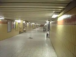 Since the construction of the new station building, it has been changed only slightly since its completion so that the basic structure of the original design is still preserved almost completely. In place of the wall paintings that have been removed there are now billboards. The former ticket office was converted into a travel center that was modified in the 1990s to fit the new corporate design of Deutsche Bahn. In addition, the entrance building now housed a baggage room, a "ServicePoint", a food shop, a book shop and a small kiosk for tobacco products and magazines. In the summer of 2006, two new sales pavilions were established for this purpose and an older bakery was removed and the ServicePoint had to be moved to the side of the hall. At the eastern end there was an office of the Bahnhofsmission charity, which provides assistance to travellers and the homeless; until the beginning of 2008, this has since been housed in the west wing of the building. Before the start of the platform underpass there is a toilet facility, which has been leased to a private operator since 2006. There have been repeated complaints in recent years regarding its cleanliness and hygiene to Deutsche Bahn, which notes, however, that a comprehensive renovation of the facility will be undertaken during the modernisation of the whole building.[8] The restaurant Bürgerstuben was housed in the western part of the building until June 2007. Its operation was terminated in October 2006 by the operator, SSP Deutschland, the successor to Deutsche Bahn's own catering operation Mitropa, in preparation for the planned station modernisation as part of the "arcades project" (Arcaden-Projekt, see below). Since Deutsche Bahn reversed the termination of the operation of the restaurant after the collapse of the arcades project, the reconstructed restaurant has been staffed by a new operator.[9] On the top floor in the western part of the building there is a conference centre and in the eastern part there are business premises. In mid-2007, work started on the establishment of a DB Lounge for first-class travellers and bahn.comfort (BahnCard) customers, which was forecast for completion in 2011.[10]