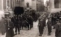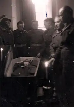 Following the end of World War II, Władysław Grydziuszko was killed in an accident near Treia, Macerata, in Italy on January 29, 1946. During a routine 2nd Armoured Brigade (Poland) training period, Władysław was killed when he fell underneath one of his tanks breaking his spine at the neck. The military considered his death "Killed in Action" (KIA) because he was on duty. His death was instantaneous, and soon afterward there was a memorial service held in his honor. Some 400 soldiers attended his funeral, and he was buried in the Polish cemetery in Loreto, Italy on January 30, 1946.[4] The two witnesses of his death were a future Polish politician named Zygmunt Ostrowski pl:Zygmunt Ostrowski and Michał Matusiewicz.