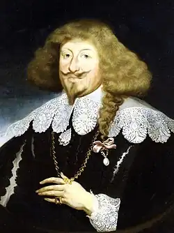 In the meantime, Władysław still tried to take a leading role in European politics, and negotiate a peaceful settlement to the Thirty Years' War, a settlement which he hoped would ease his way into regaining the Swedish crown.[44] Following the armistice of Stuhmsdorf, Władysław came to increasingly realize that his prospects for regaining the Swedish throne were dim.[45] In the years 1636–1638 he proposed several reforms to strengthen his and his dynasty's power in the Commonwealth. His first plan was an attempt to secure a hereditary province within the country, which would not be threatened by the possible power shift following a future royal election; this, however, did not gain sufficient support in the Sejm.[46] Next, Władysław attempted to create an order of chivalry, similar to the Order of the Golden Fleece, but this plan was scuttled down as well, with the szlachta and the magnates seeing this as an attempt to create a royal, loyalist elite, and traditionally opposing anything that could lead to the reduction of their extensive power.[47] Popular vote and opposition also resulted in the failure of the plan to raise taxes from trade tariffs; here it was not only the nobility but even the merchants and burghers from towns, like Gdańsk (Danzig) who were able to muster enough support (including from foreign powers) to stop the king's reforms.[48] In fact, the defeat of his plans was so total, that he was forced to make certain conciliatory gestures to the nobility, as the Sejm passed several laws constraining his authority (such as to hire foreign troops), further indicating the limits of royal power in the Commonwealth.[48]