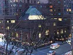 Smith designed the "long-since demolished College of Physicians and Surgeons" of Roosevelt Hospital.[5] He continued his work at the hospital and in 1892 designed the Syms Operating Theater in Roosevelt Hospital, now a teaching amphitheater and the oldest part of the evolving hospital.[6] "'The finest structure in the world for surgical operations,' according to Harper's Weekly," Funding was donated by William J. Syms, a retired gun merchant. It prominently features an 1892 glass roof that lights the operating theater with 184 seats. "The mildly Romanesque building was one where 'beauty of exterior has been sacrificed to utility of interior,' according to Harper's Weekly." Constructed of deep red brick, with granite trim, the building has little decoration, but its unusual great, semiconical skylight on top of a small brick box is memorable. The last operation occurred in 1941. It is still freestanding, even as the tower surrounds it and is now a New York City Landmark.[7]