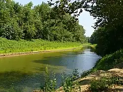 Upon entering Indiana, the river has many sharp turns; these regularly lead to log jams that can block the river. Because of the many turns in the river, during the 1830s, the state created several separate canal channels to shorten the journey between the state line and Fort Wayne as part of the Wabash and Erie Canal project. The canals were abandoned after competing railroads took over; this allowed the river to shift courses several times, resulting in the formation of many cut-offs and coves with no outlet. The river has a maze-like quality in the first seventeen-mile (27 km) stretch as it enters Indiana.[13]