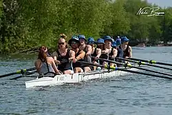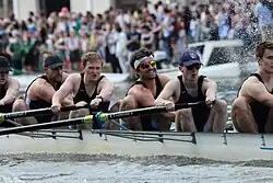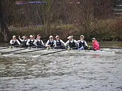 The earliest surviving record of the boat club's existence are accounts for 1837, although evidence suggests it was founded during the early 1830s.[1] Wadham competed in the first Grand Challenge Cup in 1839, losing to Trinity College, Cambridge.[2] In 1849, Wadham competed against Trinity and Oriel College, Oxford in the Ladies' Challenge Plate and the Grand Challenge Cup. Wadham won both races with Trinity coming in second.[1] It is said this victory led to Wadham's right to use Cambridge's blue-green for first VIII colours instead of its traditional light blue,[2] although this is debated.[1]
