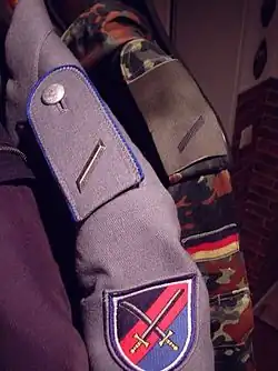 In the German military, Waffenfarbe (German: "branch-of-service colors" or "corps colors") is a visual method that the armed forces use to distinguish between different corps or troop functions in its armed services. The Waffenfarbe itself can take the form of the color of the collar patch, of the piping (embellishment) around the shoulder boards or shoulder marks, or—for enlisted ranks—of the piping around the collar and the garrison cap (Schiffchen). (In the latter places, NCOs wear cords of dark gold, officers silver, and generals gold.)[1]