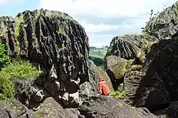 Many of the boulders have deep solution basins and fluting formed on their surfaces as they very slowly slid down the valley sides - a particularly good example of the relatively rare phenomenon of karst formation on basalt (sometimes known as proto-karst).[7] This phenomenon was documented by geologists as early as the 1920s-1940s in Hawaii[8][9] and New Zealand.[10] Usually karst landforms are formed by solution of calcareous rocks (e.g. limestone and marble) by mildly acidic percolating water. At Wairere, and elsewhere, basalt has been dissolved, probably over a much longer interval of time, by the production of weakly acidic humic acid in the leaf litter that collects around the roots of plants that grow on the top of the boulders, usually beneath a forest canopy.[11] On the top of the boulders this humic acid has etched out solution basins 20–50 cm across and of similar depth. Humic acid seeping down the sides of the boulders has, over thousands of years, dissolved deep, near-vertical flutes out of the hard basalt. In some places the fluting is no longer vertical as the boulders have rolled over or tilted since it was formed.
