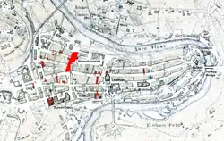 Waisenhausplatz was first used to describe three formerly separate plazas in the 19th century.[1] The southern portion (Nr. 2–14) was built over the ditch in front of the second city wall in the 16th century. Originally known as Viehmarkt (Cattle Market), then Holzmarkt (Wood Market), later as Weinplatz (Wine Plaza) and finally in the 18th and 19th centuries as Schweinemarkt (Pork Market). The middle section of Waisenhausplatz (Nr. 16–28) was also built over the protective ditch, the Tachnaglergraben, and was known as Zeughausplatz (Armory Plaza). The northern section (Nr. 29/30) was built in 1784 and was always known as Waisenhausplatz.