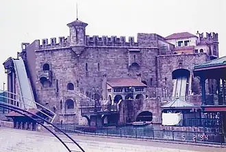 The Porto Europa theme park was created by MCA Planning and Development (P&D), which was Universal Studios' creative arm prior to its renaming as Universal Creative in 1997. The park was built using American specialty vendors and Japanese construction companies, and opened in July 1994. With a footprint of 4.5 acres (1.8 hectares), Porto Europa consists of three themed areas: a French, an Italian and a Spanish town.[9] There are three major attractions, a flume ride/dark ride combination, a motion simulator/film ride, and an indoor stunt show which is now closed, with the theater space empty. The smaller attractions at opening included a jazz club, disco, cinema, laser tag, and virtual reality installation.[10] There are also retail outlets, restaurants, and street shows.[11][12][13]