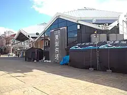 An ichiba is a market, of which there are two in Marina City. The larger is a "fisherman's wharf"-style fish market, which sells both fresh-caught fish and cooked fish dishes. There are small fire pits available both inside and outside to allow guests to cook their purchases on site. Aside from the food, the principal attraction is a whole tuna filleting show. The building itself features 6,767.08 square meters of floor space on four levels.[26] The smaller market is an outdoor farmers market, featuring fruit and vegetables from the local farmers.[27][28]