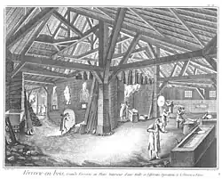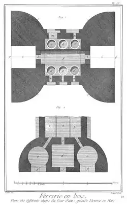 Besides the descriptions of Theophilus and Agricola, the only depiction of an early forest glasshouse is from Bohemia in approximately 1380 (The Mandeville Miniature).[3] This shows a furnace where all the high temperature processes of glassmaking were performed in the one structure containing several ovens whose varying temperatures might be controlled to the necessary extent by constant attention. The raw materials are mixed at a pit nearby and carried down in pans to be fritted in one of the ovens, optimum temperature up to 1100 °C. The frit is melted at high temperature up to 1400 °C in crucibles in a second oven, and when ready, the glass is being blown into objects. These are placed in the annealing oven to cool. The whole structure is enclosed in a wooden building, and it is likely that wood was stored and dried above the furnace.[15][16] Remains of a similar structure from the late 15th century have been found in Eichsfeld in Germany.[3] Another design found archaeologically from the 17th century is the 'butterfly furnace'. These furnaces were made from stone and the crucibles from imported, highly-refractory clay.[15] They differ in style from the Islamic furnaces of the east, and those of southern Europe, the 'beehive' style where the annealing chamber is above the main oven rather than on the same level.[1]