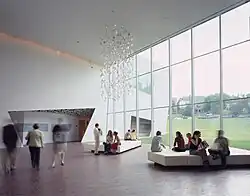 In 2005, Barnes's original building underwent a $67 million expansion designed by Swiss architects Jacques Herzog and Pierre de Meuron.[8] The addition was built on a "town square" concept meant to open up Barnes's boxlike building through accessible gathering spaces.[48] Its central element is an abstract geometric tower made of aluminum mesh panels, built for Herzog & de Meuron by the Minnesota firm Spantek,[49] and glass windows that holds the theater, restaurant, and shop spaces. Windowed halls containing expanded gallery and atrium spaces connect the tower to the original structure.[50]