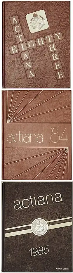 The yearbook Actiana is the record of the school's engagements (since 1949).[12][3] Year books were first introduced under Principal Dickenson (1917–1933), originally as the Tatler.[2]