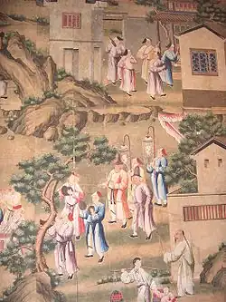Hand-painted Chinese wallpaper showing a funeral procession, made for the European market, c. 1780