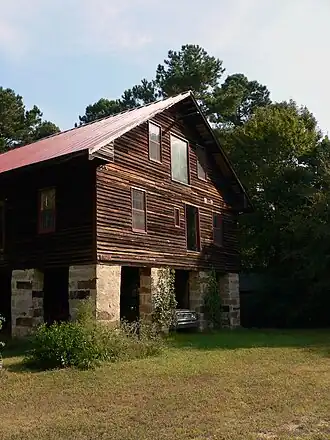 The gin house is a 2+1⁄2-story-tall, hand-hewn timber frame structure, approximately 36 feet (11 m) wide and 56 feet (17 m) deep. The frontmost two-thirds of the structure is supported by tall, 2 feet (0.61 m) thick granite ashlar pillars that form a square, open-air space on the ground floor in which the mule track and power shaft were located. The rear third of the gin house rests on short, granite rubble piers, and housed the ground-floor pressing and packaging rooms. Most of the ginning equipment resided on the second floor of the gin house. The third floor was used for storage of baled cotton.