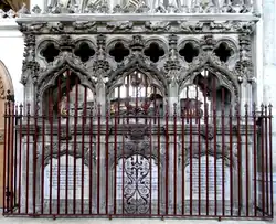 His monument in the choir on the north side of the high altar is the cathedral's most important 14th-century monument. It consists of a recumbent robed effigy of the bishop, holding in his left hand a crozier and in his right hand a book, within a gothic canopy all made of Beer stone. On the ceiling of the canopy, invisible to the casual observer but looking down onto the bishop's effigy, is a contemporary painting of Christ displaying his Five Holy Wounds. An epitaph by John Hooker was added in 1568 but later removed.[3]
