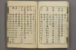 The Wamyō ruijushō, survives in both a 10-volume edition (十巻本) and a 20-volume edition (二十巻本). The larger one was published in 1617 with a commentary by Nawa Dōen (那波道円, 1595–1648) and was used in the Edo period until the 1883 publication of the 10-volume edition annotated by Kariya Ekisai (狩谷棭齋, 1775–1835),[1] also known as the Senchū Wamyō ruijushō (箋注倭名類聚抄 "Annotated commentary to the Wamyō ruijushō"). The 10-volume edition has 24 main headings divided into a total of 128 subheadings, while the 20-volume version has 32 and 249, respectively. The table below illustrates how words are semantically categorized in the 10-volume edition.