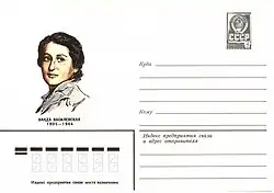 In Poland Wasilewska, despite her own established position, was known as "Leon's daughter". Leon Wasilewski died in December 1936. Wasilewska recounted her comrades and communists bringing to his funeral a wreath with an inscription that read: "For Wanda's father".[20] It is not clear what Wasilewska's position was on Stalin's persecution and extermination of Polish communists and the 1938 dissolution of the Communist Party of Poland ordered by the Comintern (she seems to have justified a "necessity" of "certain actions", given the pressure and isolation that the Soviet state was subjected to), but on the eve of World War II she was a firm supporter of the Soviet Union, which she saw as the only force capable of stopping fascism.[18] Wasilewska was highly regarded and accomplished in the field of social work. Helping the needy, especially children, was her natural inclination and passion.[13] Early in the period of her studies Wasilewska met Roman Szymański, a mathematics student and popular PPS activist. They married and had a daughter Ewa. Szymański, however, died of typhus in August 1931.[4][14] Later the same year Wasilewska met Marian Bogatko, a construction worker active in the PPS. Their successful relationship, purposely not sanctioned by traditional marriage, became a formal marriage in late 1936, when Wasilewska and Bogatko needed documents to travel to the Soviet Union.[13][21] Bogatko was murdered by Soviet agents in May 1940 in Lviv.[22] At that time Wasilewska was already a delegate to the Supreme Soviet of the Soviet Union. There are different versions of what had happened or who was the actual target. Nikita Khrushchev later wrote: "Wasilewska believed that it was not the case of premeditation and continued active work";[23] according to him, Bogatko was killed by mistake.[24]