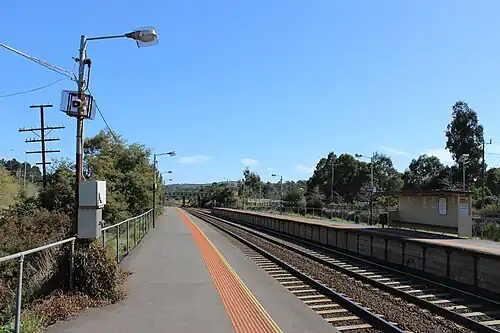 In 1978, all signals at the station were removed. The station building on the down platform (Platform 2) was removed in 1979,[4] and the current shelters on the platforms were provided in 1990.[3] A weatherboard shelter on the down platform had been removed by August 1991.[5]