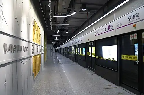Wangyuan Road (simplified Chinese: 望园路; traditional Chinese: 望園路; pinyin: Wàngyuán Lù) is a station on Line 5 of the Shanghai Metro. Located at Wangyuan Road and Hangnan Highway in the city's Fengxian District, the station is located on the main branch of Line 5 and opened as part of the southern extension of Line 5 on 30 December 2018.[1] It is an underground station.[2][3]