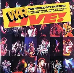 War Live is the first live album by American band War, recorded during a four-night engagement at Chicago's High Chapparral club and released as a double LP on United Artists Records in 1973.[4] The album was reissued on Rhino Records as a double disc CD on 1992 September 15 [5] and again on 2008 March 31.[6]
