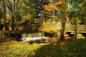 The park was established in the 1930s and was constructed in part with funding from the Works Progress Administration. The park is located at the site of West Bridgewater's earliest industrial activities, a mill site dating to the 17th century. This early use spawned a variety of other water-powered industrial uses in the 18th and 19th centuries, and was notably the site of Ames Shovel Company's first factory. Other industrial activities here included a sawmill, gristmill, shingle mill and even a pickle factory.[2]