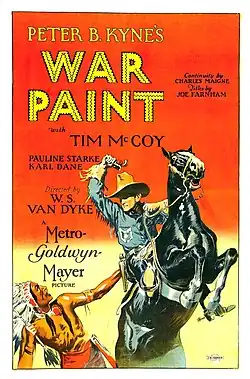 War Paint is a 1926 American silent Western film directed by W. S. Van Dyke. The film stars Tim McCoy. Louis B. Mayer observed the profits made by other studios with western franchises such as Tom Mix, Buck Jones or Hoot Gibson. He selected a genuine army officer who had lived with Indian tribes to come to Hollywood as an advisor on 1922's The Covered Wagon: Colonel Timothy John Fitzgerald McCoy. His debut as Tim McCoy in War Paint was announced under the banner "He's the real McCoy!" In order to maximize the economics, the film was shot simultaneously on location with another film, Winners of the Wilderness.[1] The film is considered lost. A trailer however is preserved at the Library of Congress.[2][3][4][5]