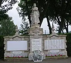 Guise was where Jean-Baptiste Godin, the humanist and philanthropist, built his factory which was intended as an example of how the working classes should be treated. Alongside the factory, Godin had built all the amenities which he considered the workers should have; housing, laundry facilities, a school, a theatre, gardens, a swimming pool, etc. In the grounds are a monument which remembers those Familistere men who lost their lives in the Great War, the Monument aux morts du Familistère de Guise, sculpted by the brothers Jan et Joël Martel (1896–1966). These brothers were well known as avant-garde and cubist sculptors.[14][15][16] Guise was also the scene of a fierce battle in 1914 when the 5th French Army, retreating before the advancing German armies, stopped their retreat and engaged with the enemy. The 5th Army was commanded by General Lanrezac and the Martel brothers were sculptors of the monument which marks this battle. Several photographs of the "Lanrezac monument" are shown below as are photographs of the Familistere monument aux morts. |