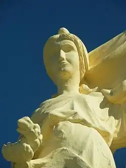 Long Monument aux morts | Long Somme | Long's war memorial features a bronze cast by the foundry Fonderies Montagutelli Frères of Paris. This was the work of the sculptor Georges Chauvel (1886–1962). It is entitled "La France couronnant un soldat blessé " and shows a wounded soldier receiving a crown of laurels from a female figure representing France. On the pedestal itself there is a bas-relief this showing the mobilisation of Long and featuring the then mayor of Long and the men of Long killed in the war all responding to the call to mobilise.[16] | |
