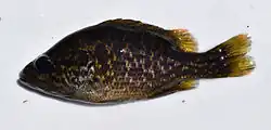 Adult warmouth appear dusky, with a mottled brown, somewhat purplish coloration.[4][5] The ventral surfaces are yellow,[4] and the breeding male has a bright-orange spot at the base of the dorsal fin.[5] Three to five reddish-brown streaks extend from the eyes,[4] whose irises are reddish, a feature most pronounced in breeding males,[6] with a red dot present on the otherwise black opercular flaps, outlined in yellow.[7] It most commonly has three spines in the anal fin and 6 to 13 spines in the dorsal fin,[6] with small teeth present on the tongue and palatine bones.[8] These fish are typically 4 to 10 inches (10 to 25 centimetres) long, but can grow to over one foot (30 cm) in length, and reach 2.25 pounds (1.02 kg).[4] The warmouth is occasionally confused with the rock bass (Ambloplites rupestris) or green sunfish (Lepomis cyanellus), both of which share its relatively large mouth and heavy body. However, the green sunfish generally has a greenish-blue vermiculate pattern on its cheeks,[9] a black spot near the base of the dorsal and anal fins,[7] fins that are bordered in yellowish-white[9] and no teeth on the tongue.[6][9] The rock bass has five or six spines in its anal fin as opposed to the three in the warmouth.[6]