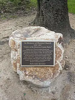 At the 25th anniversary of the founding of the Monterey County Parks Department, Republican Charmaine Cruchett thanked Church and said, "The little fox I recently saw dashing across Castroville Boulevard into Manzanita Park may not know who provided that haven, but certainly all North Countians should. I thank you Warren. My children thank you. And if we're lucky, our human progeny can share your parks progeny forever."[9] The county administrative office released a memorandum October 2, 2006, at the 40th anniversary of the Parks Department saying, "The highlight of the event was the attendance of Warren Church... who was instrumental in establishing the Parks Department and Charter Park Commissioners, from 1966."[23] In 1977 Church said he had tried to protect