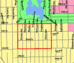 The Washington Park community area occupies the Southern two-thirds of the former Washington Park Race Track. The area is a 4-city block (8 east-west half-blocks) by 3-city block area in northwest corner of the Woodlawn community area and bounded by Dr. Martin Luther King Drive to the west, South Cottage Grove Avenue to the East, East 60th Street to the North and East 63rd Street to the South. This area is directly south of Washington Park and both south and east of the Washington Park community area.[1]