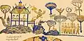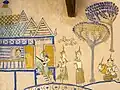 The interior and exterior of the sim contain painted murals created by local artisans with powder paints in indigo, green, yellow, black, and brown; the brightly colored murals are designed to stand out from their light, cream-colored background.[7] The interior murals include thirteen chapters of the Vessantara Jātaka depicted in panels similar to the cloth scrolls used to tell the same stories of Buddha's life during local Bun Phawet festivals with captions naming each scene.[8] The exterior murals are mostly scenes from the Sinsai epic, the Isan version of the Lao Sang Sinxay epic. The story of the rescue of a princess from a yaksha by her three nephews begins on the south wall of the sim and travel clockwise around the building. On the west wall, the Sinsai retelling is interrupted by a panel depicting scenes from hell (naraka).[9]